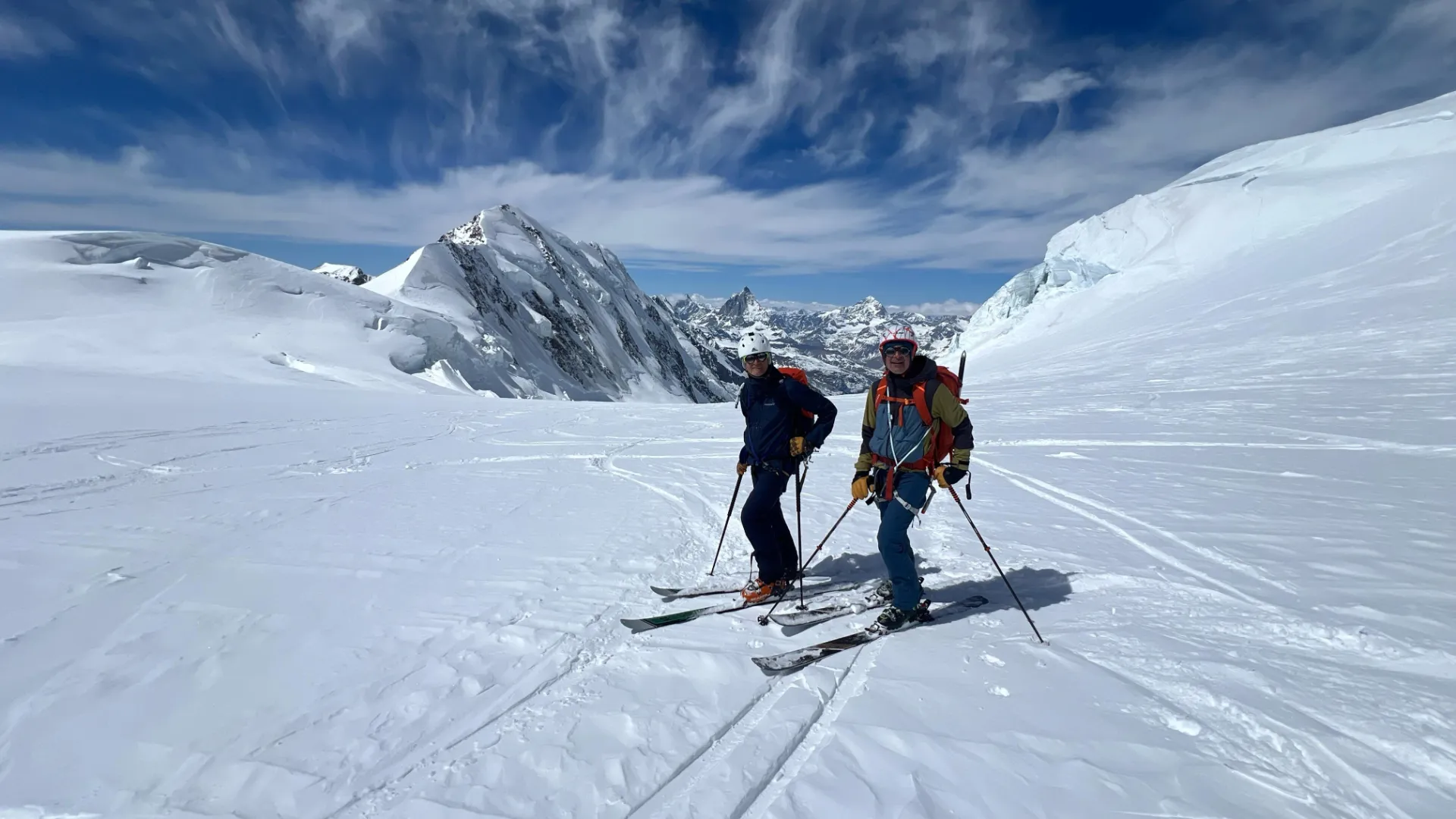 Programs can be fully adapted to the skiing and mountaineering level of the participants. We propose everything from itineraries with limited technical difficulty, ideal for gaining experience on glaciers and at altitude, to more committing and technically demanding ascents, such as the Nordend or the Dufourspitze, which require strong ski technique, efficient crampon use and solid high-mountain experience.